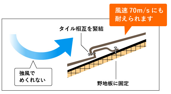 独自のインターンロック工法でしっかり固定するので、風速70m/sの風圧に耐えられます。        天然石の凹凸が雪止め金具と同等の効果を発揮します。