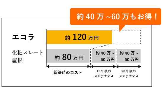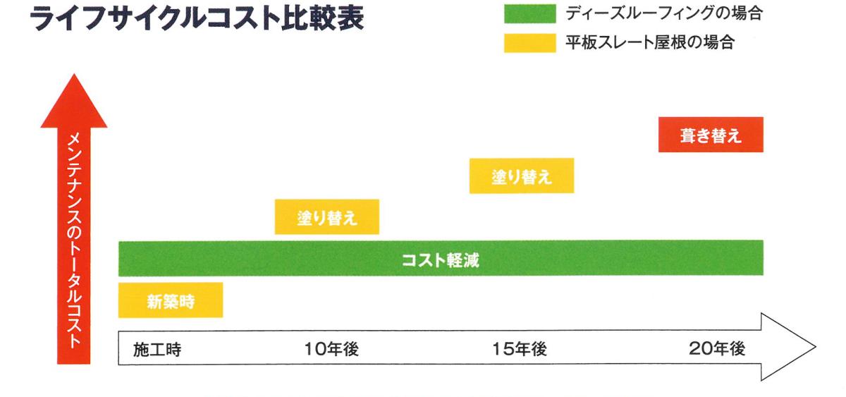 初期費用はやや高めですが、1回目の塗り替えでトータルコストは逆転し長く住むほどお得な屋根材です。